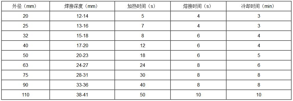 注:1、熱溶承接溫度260±10℃,本表適用的環(huán)境溫度為20℃,低于環(huán)境溫度時(shí),加熱時(shí)間可適當(dāng)延長(zhǎng);